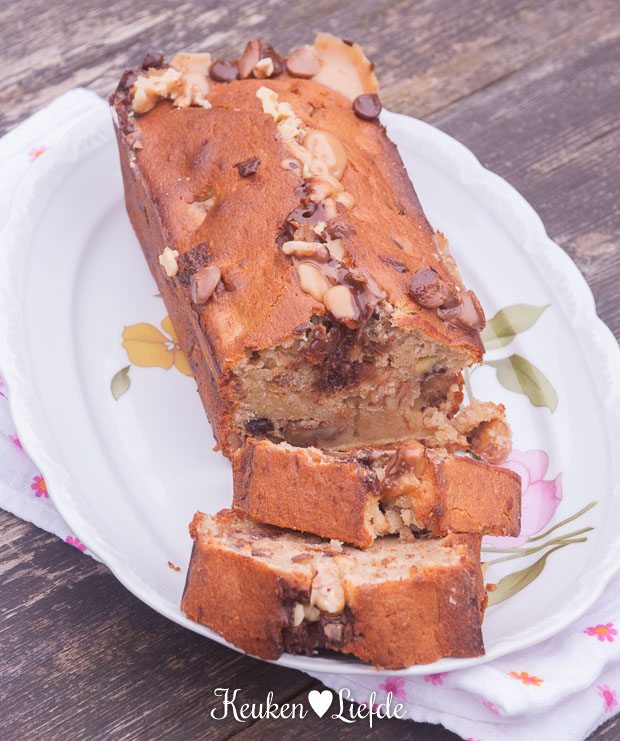 Bananenbrood Chunky Monkey Style – Dit bananenbrood is geïnspireerd op mijn liefde voor Chunky Monkey Ice Cream: Romig bananenijs van Ben & Jerry’s gevuld met knapperige walnoot en grote brokken karamel en chocolade.