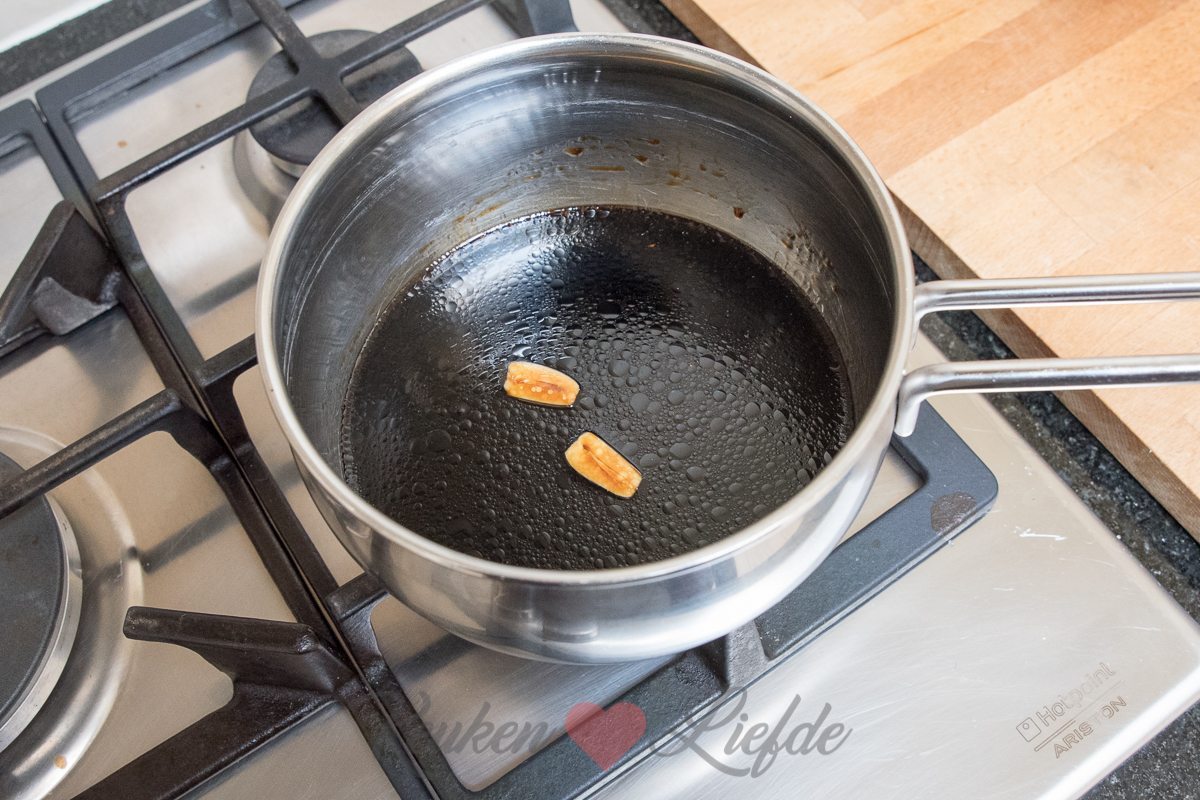 Doe alle ingrediënten voor de teriyakisaus in een pannetje en breng aan de kook. Laat een minuut zachtjes doorkoken en zet het vuur dan uit. Laat de teriyakisaus afkoelen. Dit kan al een dag van tevoren.