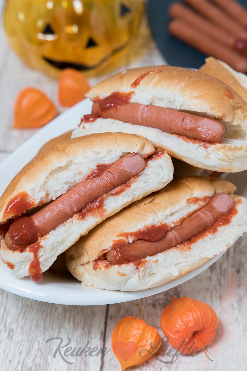 Durf jij je tanden hierin te zetten? Speciaal voor deze spooky Halloween-dag maakte ik broodje hotdog met afgehakte vingers! Niet echt natuurlijk. Ha, stel je voor! Het bewerken van de worstjes is even een werkje, maar dan heb je ook wat. Zeg nou zelf, ze lijken toch net echt! Heerlijk met een kommetje pompoensoep erbij.
