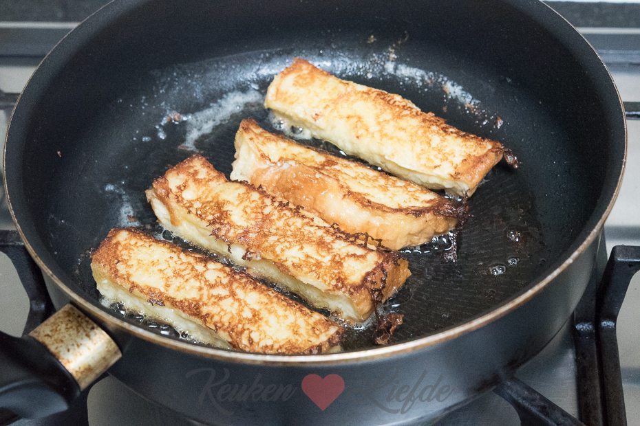 Verhit de koekenpan met een flinke scheut bakboter en laat even uitbruisen. Wentel de briocherepen rondom snel — als ze te lang weken kun je ze niet goed bakken — door het melkmengsel en leg in de koekenpan. Bak ze rondom op middelhoog vuur goudbruin.