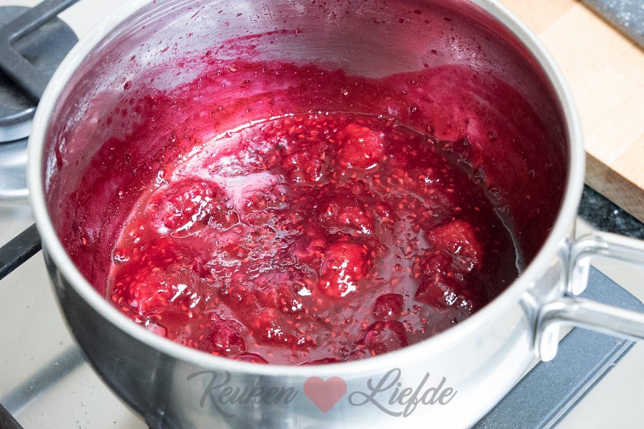 Doe de frambozen samen met 2 el suiker in een pannetje en verwarm op middelhoog vuur. Kook circa 8 minuten, of totdat de frambozen zacht zijn en hun sap loslaten. Druk de frambozen door een fijne zeef en vang de frambozensaus op. Zet zolang opzij.