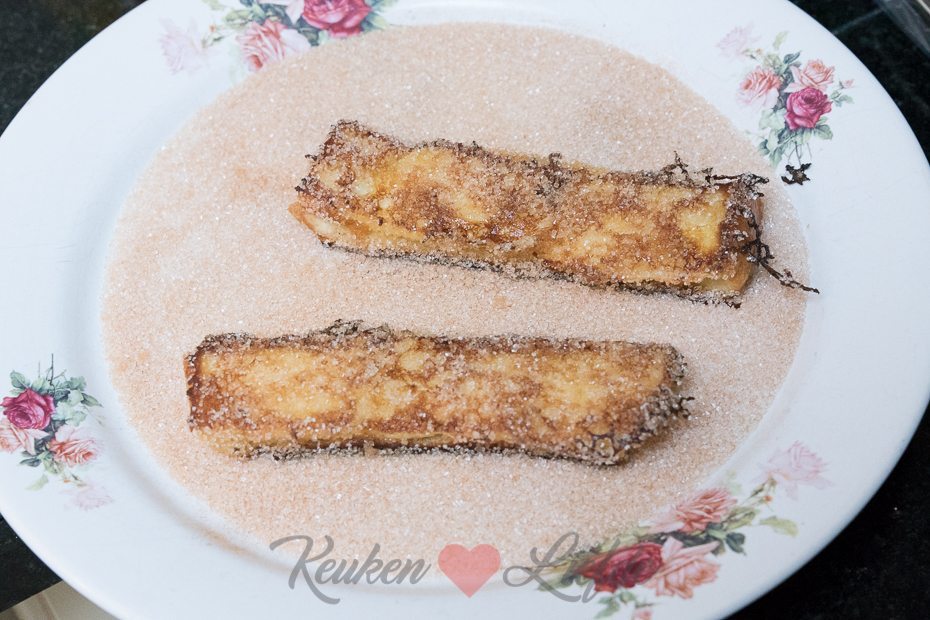In plaats van de plakken brioche in zijn geheel te bakken, snijd ik ze in lange repen die ik na het bakken door kaneelsuiker rol (churros). Dat ziet er leuk uit en je kunt ze zonder bestek serveren. Scheelt weer afwas. 😉 Deze wentelteefjes smaken heerlijk als ontbijt of lunch, maar ook als dessert met een bolletje ijs erbij. De zelfgemaakte frambozensaus maakt het VerrukGeluk helemaal af!