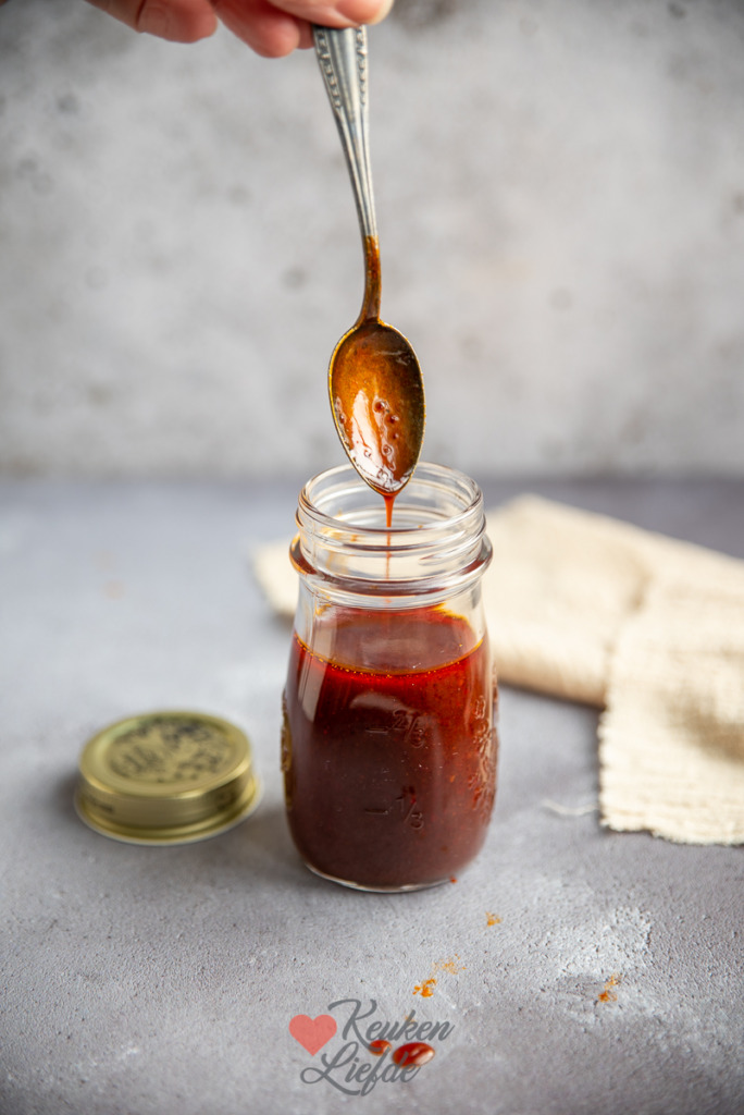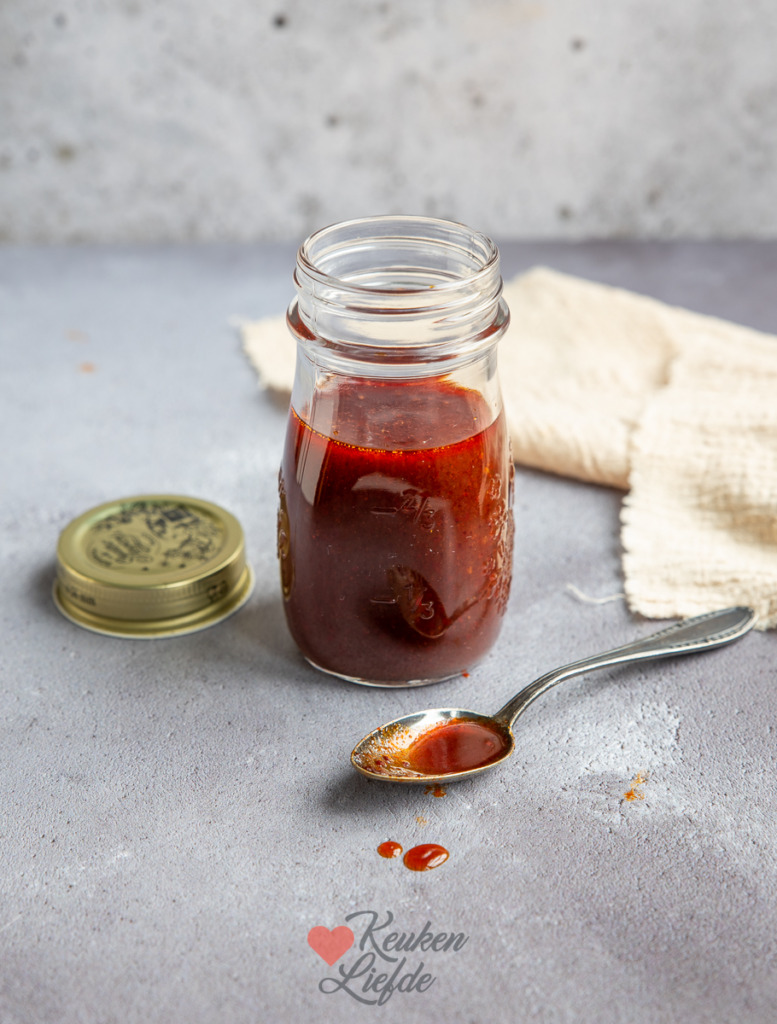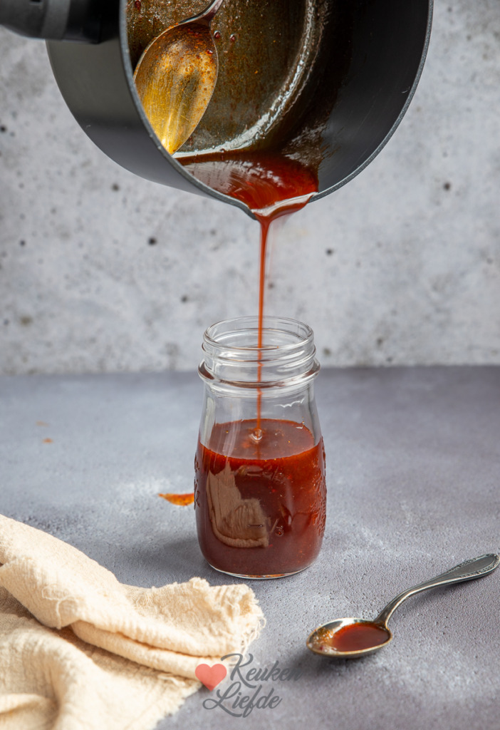 Als je de saus los in de koelkast wilt bewaren als smaakmaker, laat hem dan eerst helemaal afkoelen. Bewaar hem vervolgens in een potje of fles met goed afsluitbare deksel in de koelkast. Je kunt hem dan ongeveer een week bewaren.