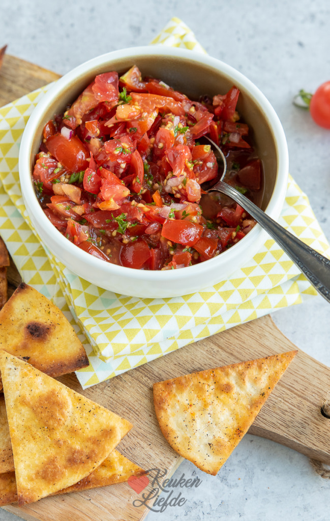 Wij hebben nog nooit zo’n goede tomatenoogst gehad als dit jaar wat natuurlijk te danken is aan het zonnige weer. Maar het zijn meer tomaten dan we kunnen eten. Dit is een heerlijk recept om je cherrytomatenoogst iets kleiner te maken. Een lekkere frisse salsa gemaakt van zoete cherrytomaatjes met knoflook en limoen. Heerlijk op de borrelplank met zelfgemaakte tortillachips (recept ga ik binnenkort met je delen), of serveer bij een lekkere Mexicaanse maaltijd.