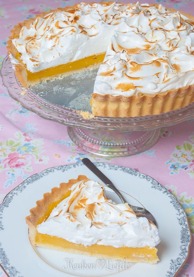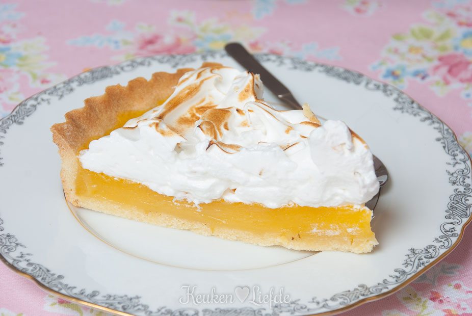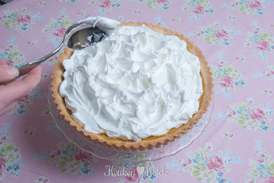 Schep het meringueschuim op de citroentaart en trek met de achterkant van een lepel pieken in het schuim. Brand met een gasbrander, totdat de pieken goudbruin kleuren.
