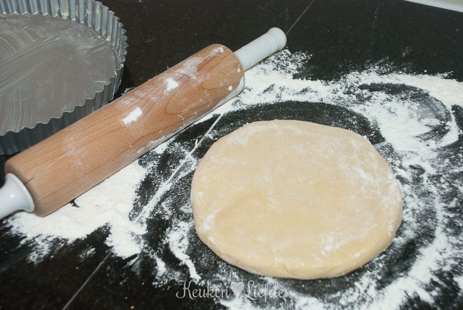 Vet de springvorm in met wat boter. Meng alle ingediënten (behalve het ei) voor de bodem door elkaar (met je handen of in de keukenmachine), totdat er zich kruimels beginnen te vormen. Voeg dan net zoveel ei toe, totdat je een gladde deegbal hebt die niet meer plakt. Plakt het deeg teveel, voeg dan wat extra bloem toe. Bestuif het aanrecht met wat bloem en rol het deeg uit, tot een ronde lap iets groter dan de springvorm. Bekleed de vorm met het deeg en druk lichtjes aan (het deeg dat je overhoudt kun je gebruiken voor een kleiner taartje of invriezen en later gebruiken). Prik met een vork gaatjes in de bodem en zet de vorm in de vriezer.