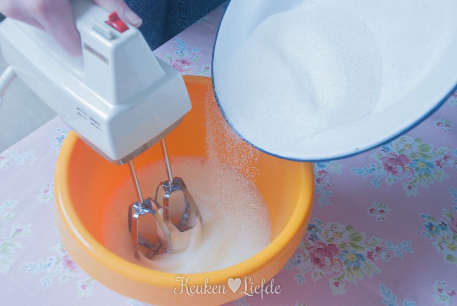Klop de eiwitten samen met de suiker tot stijve pieken (voeg de suiker pas na enkele minuten kloppen, geleidelijk toe aan de eiwitten).