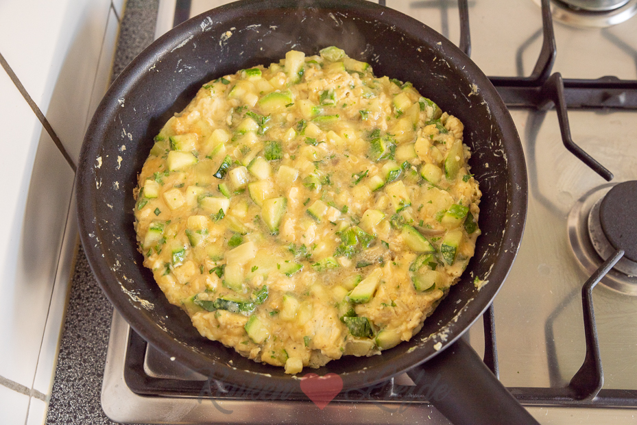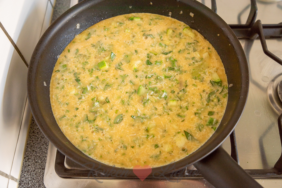 Klop in een kom de eieren los met de parmezaan (houd wat achter voor garnering), peterselie en basilicum. Breng op smaak met zout en peper. Schenk het eimengsel over de courgette in de koekenpan. Roer voorzichtig met een bakspatel over de bodem en duw steeds de randen los. Roer niet te hard, anders krijg je roerei. Stop met roeren zodra het eimengsel begint te stollen. Doe de deksel op de pan en laat de frittata in ca. 7 minuten op heel laag vuur stollen.