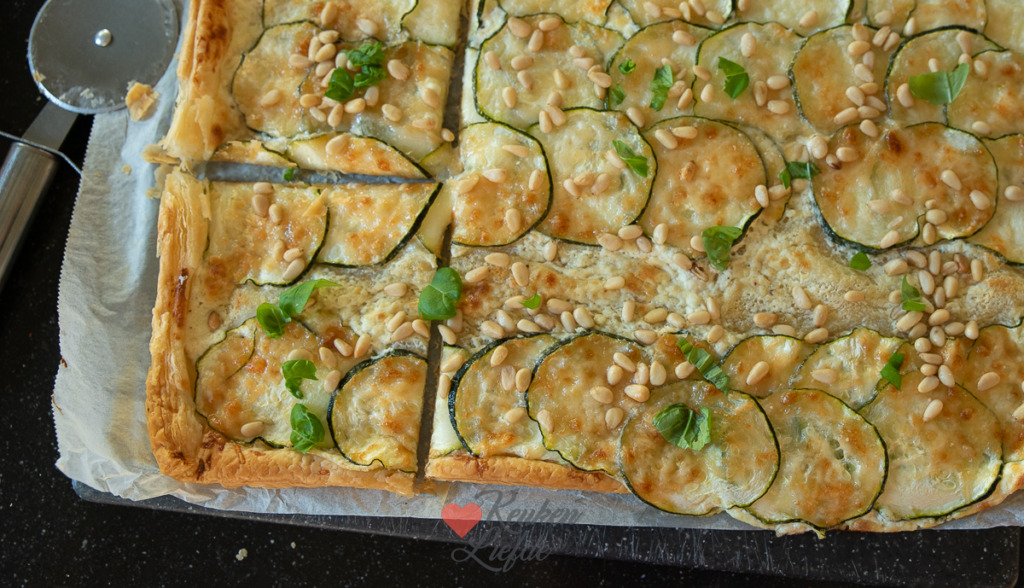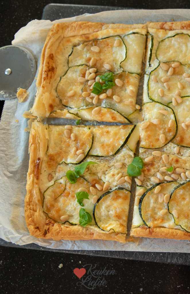 Johan vond dit recept voor courgette plaattaart op de website van Miljuschka en gaf er een eigen draai aan. Zo verving hij het hartig taartdeeg door bladerdeeg en voegde wat extra smaakmakers toe zoals citroenrasp en chilivlokken. Dit gerecht is heel eenvoudig om te maken en smaakt heerlijk. Wij aten het als avondeten met een kom tomatensoep erbij, maar je kunt het ook in kleine vierkantjes snijden en als hapje bij de borrel serveren of als lunchgerecht op tafel zetten.
