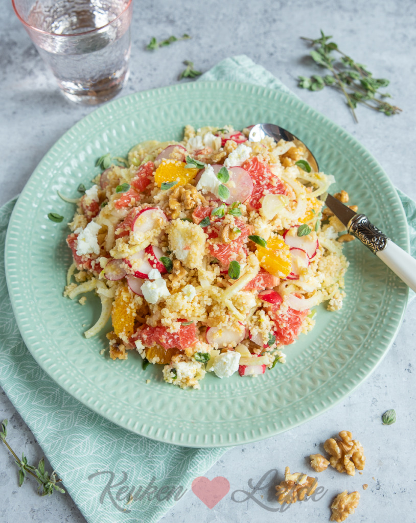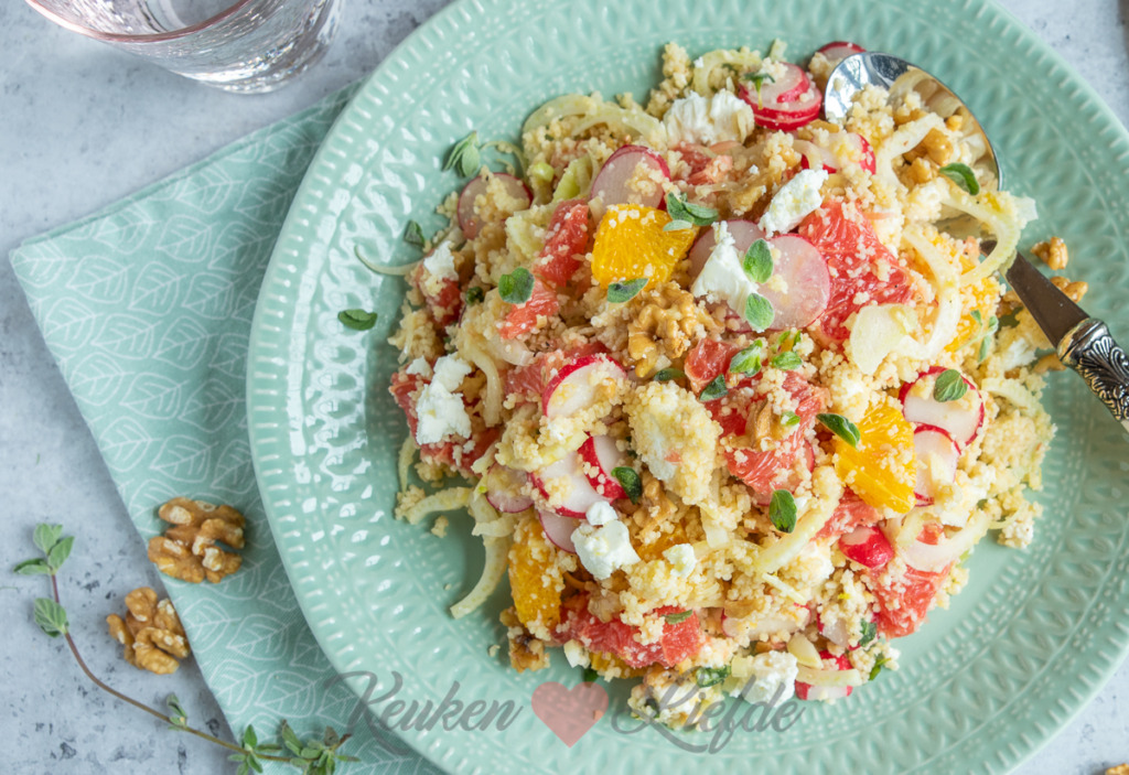 Couscous is een heerlijk ingrediënt om mee te koken als je weinig tijd hebt. Je hoeft er alleen kokend water (of bouillon) overheen te gieten en de couscous even te laten wellen. Vervolgens kun je verse ingrediënten naar keuze toevoegen. Deze couscous is gevuld met frisse grapefruit en sinaasappel, venkel, walnoten en romige feta. Echt verrassend lekker! Serveer als onderdeel van een hoofdgerecht, of als lunchgerecht.