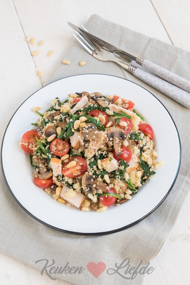 Roer de couscous los met een vork en voeg hem, samen met de gerookte kip, cherrytomaten, pijnboompitten en een flinke scheut olijfolie, toe aan het spinaziemengsel. Meng goed door elkaar en breng op smaak met zout en peper.