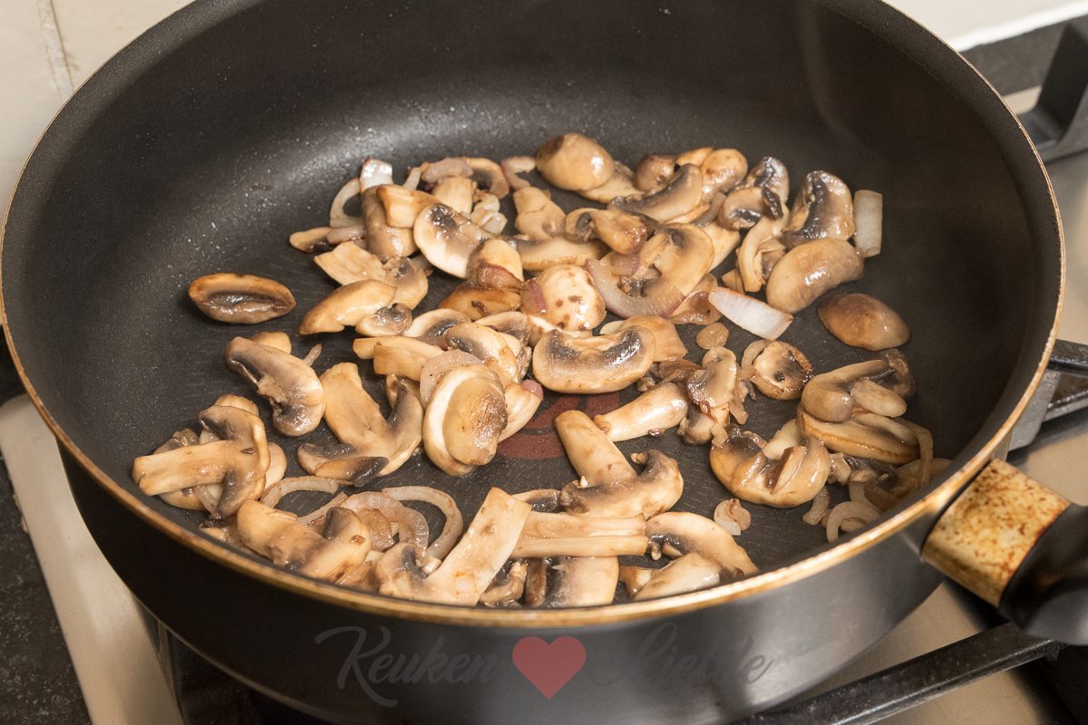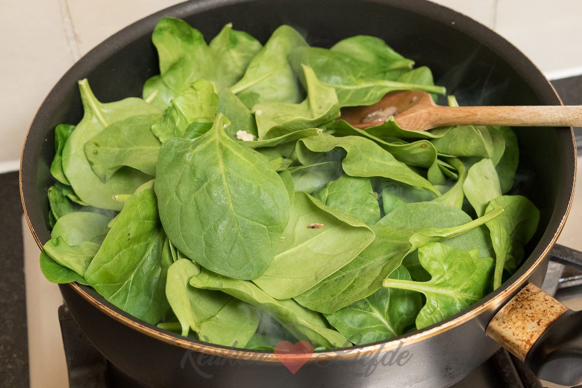 Verhit een grote hapjespan met een scheut olie en bak de ui en champignons op hoog vuur, totdat het vocht uit de champignons verdampt is en de champignons beginnen te kleuren. Voeg beetje bij beetje de spinazie toe en laat slinken. Voeg ook de knoflook toe. Bak op hoog vuur verder totdat al het vocht uit de spinazie verdampt is. Breng op smaak met zout en peper uit de molen.