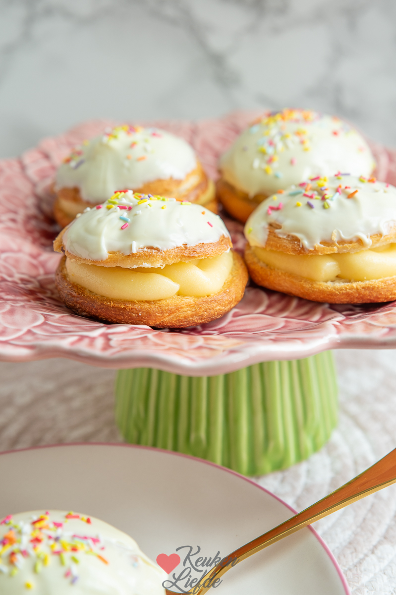 Ik heb gekozen voor een vulling van gele room. Tijdens het maken van de broodjes dacht ik eraan dat het ook lekker zou zijn om bovenop de gele room wat plakjes aardbei te leggen.