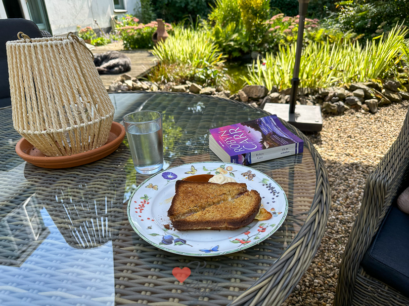 Het weekend zit er weer op, de wekker gaat vroeg. Als iedereen de deur uit is begin ik mijn werkdag op kantoor achter de computer met cappuccino. Ik schrijf onder andere een groot deel van dit Kijkje voor morgen en het artikel voor woensdag maak ik af en plan ik in. Morgen en woensdag heb ik twee kookdagen en dan is het fijn als ik ’s ochtends op tijd kan beginnen. Tussen de middag eet ik een tosti die ik buiten in het zonnetje nuttig. Wat een cadeautje dit mooie weer, daar moeten we nog even van genieten! Eind van dit middag maak ik courgettesoep voor het avondeten. Die krengen in de moestuin blijven maar groeien. Ik serveer de soep met verkruimelde, krokant gebakken bacon en kaascroutons uit de oven.