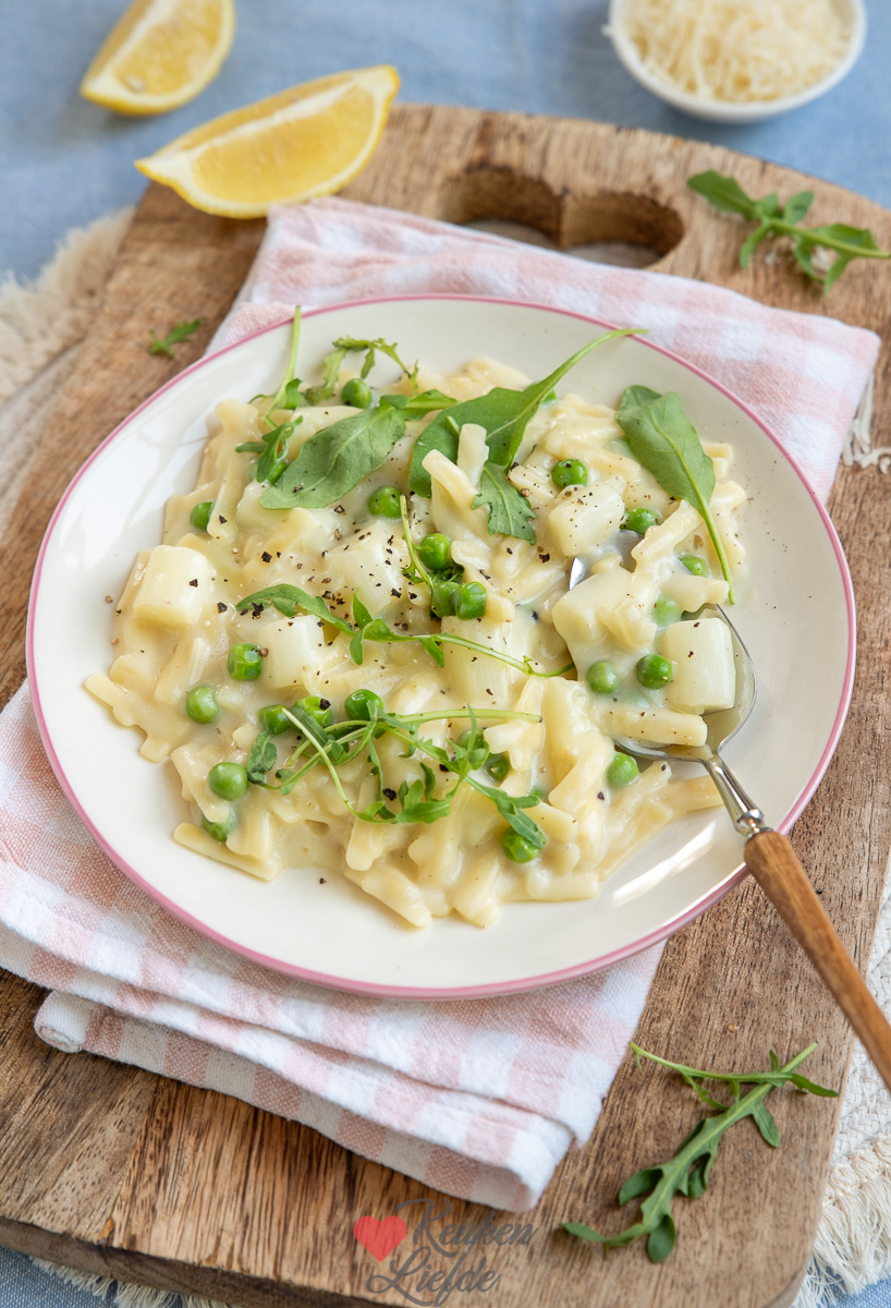Eenpanspasta met witte asperge – Het aspergeseizoen komt langzaam op zijn eind. Vanaf 24 juni worden er geen asperges meer gestoken, dus geniet ervan zolang het kan. Deze romige eenpanspasta met witte asperge, doperwten en parmezaan is makkelijk om te maken en je hebt bijna geen afwas. Makkelijk en lekker, ik hou ervan.
