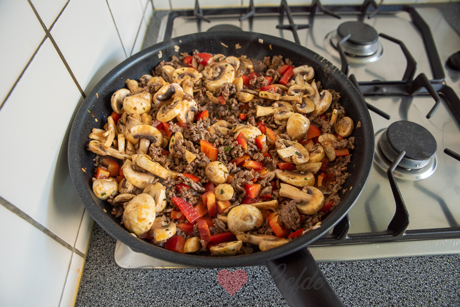 Verhit de koekenpan met een scheutje zonnebloemolie en voeg de uien, suiker en wat zout toe. Bak op laag vuur tot de uien zacht zijn en beginnen te kleuren. Door de suiker gaan de uien een beetje karameliseren, wat heel lekker is! Voeg de paprika-, komijn- en gemberpoeder, oregano en het gehakt toe en bak op middelhoog vuur rul. Voeg de paprika, champignons en mais toe en bak 5 minuten mee. Breng op smaak met zout en peper. Voeg tomaten frito toe (een paar eetlepels, genoeg om het gehaktmengsel lekker smeuïg te maken), 1 flinke eetlepel harissa en de peterselie (houd wat achter voor garnering) toe. Laat de saus 2 minuten zachtjes pruttelen.