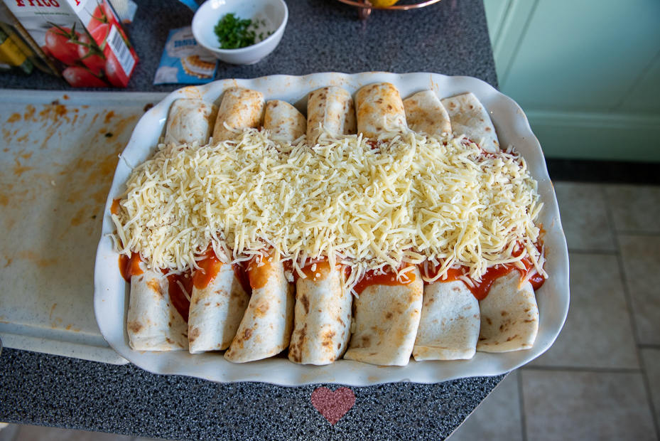 Schep een flinke opscheplepel van de gehaktvulling op een wrap en rol strak op. Leg met de naadkant naar beneden in de ovenschaal. Doe hetzelfde met de overige wraps en gehaktvulling. Smeer wat tomaten frito over de bovenkant van de wraps en bestrooi met de geraspte kaas.