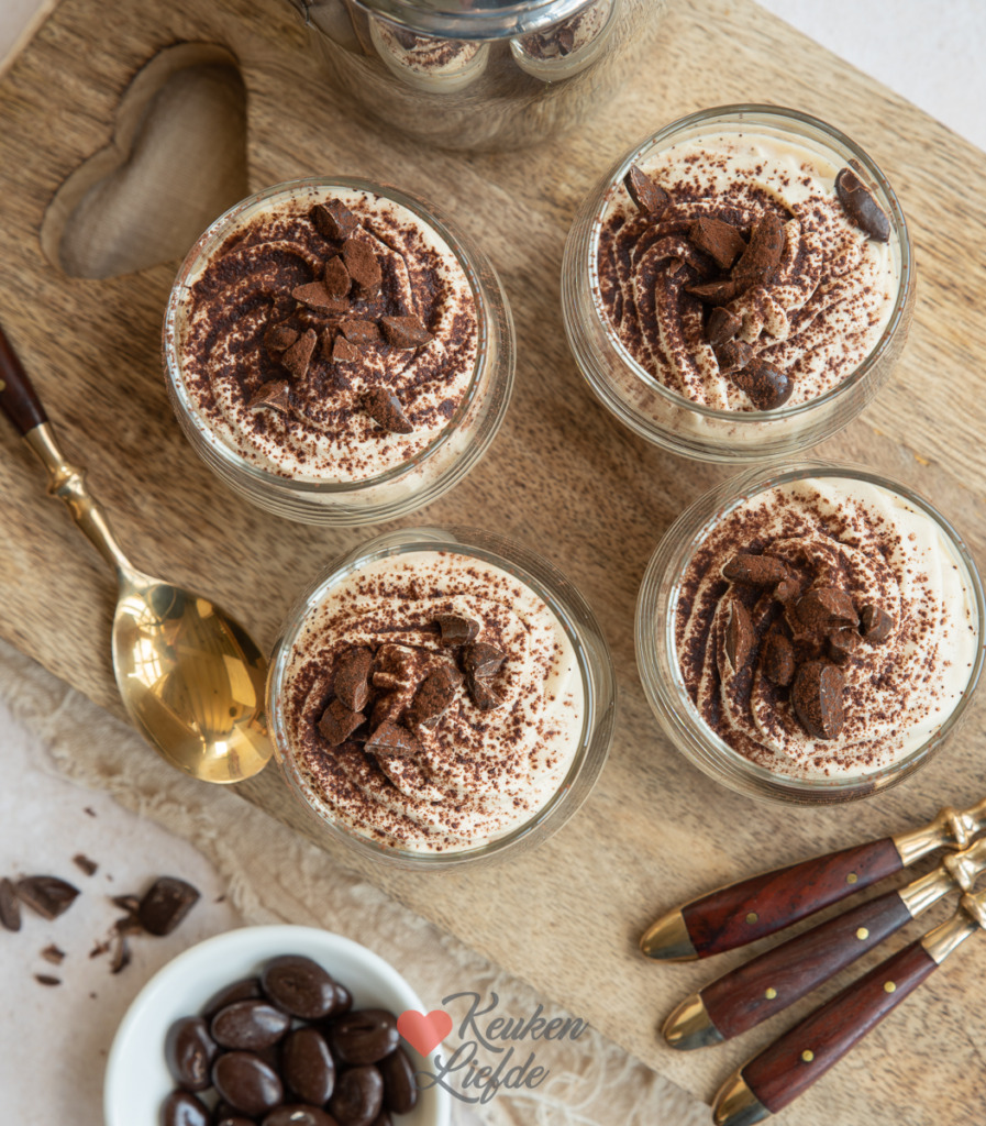 Dit heerlijke dessert is bedacht in Italië. De Italianen noemen het crema al caffè wat zoveel betekent als koffieroom. De bereiding is supersimpel. Je maakt het door gezoete en afgekoelde espresso te mengen met slagroom en deze luchtig te kloppen. Spuit of lepel de mousse in een mooi glas, garneer met wat cacaopoeder en mokkaboontjes, en finito!