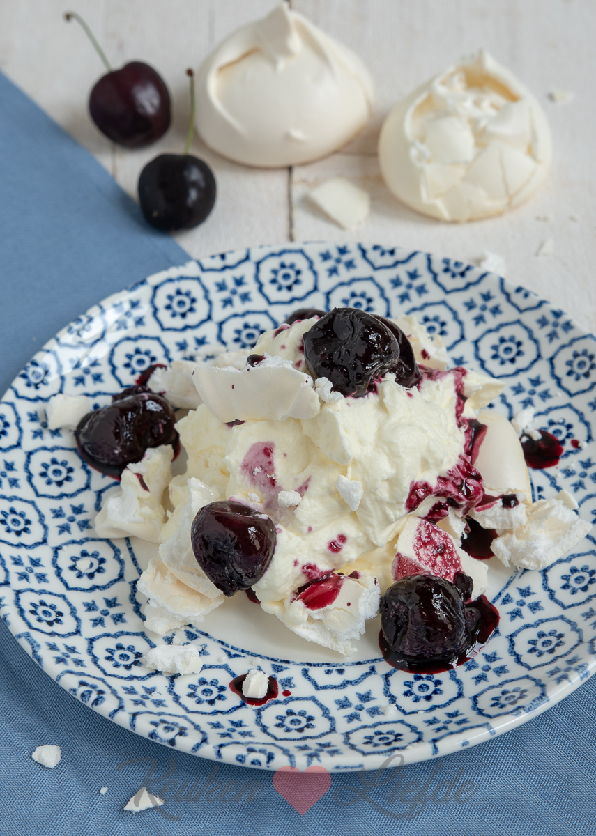 Roer wat opgeklopte slagroom, verkruimelde meringue en aardbeien rommelig door elkaar en je hebt het klassiek Engelse dessert eton mess! Voor deze variant vervang ik de aardbeien door kersen. Dat is minstens zo lekker!