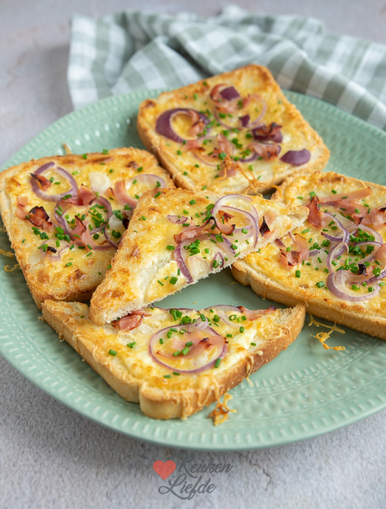 Een leuke en snelle variant op de Duitse flammkuchen is deze flammkuchen toast. Lekker als lunch, tussendoor snack, of serveer met een lekkere kom soep erbij als avondeten. Je kunt het brood ook in vieren snijden en de flammkuchen toast als borrelhapje serveren.