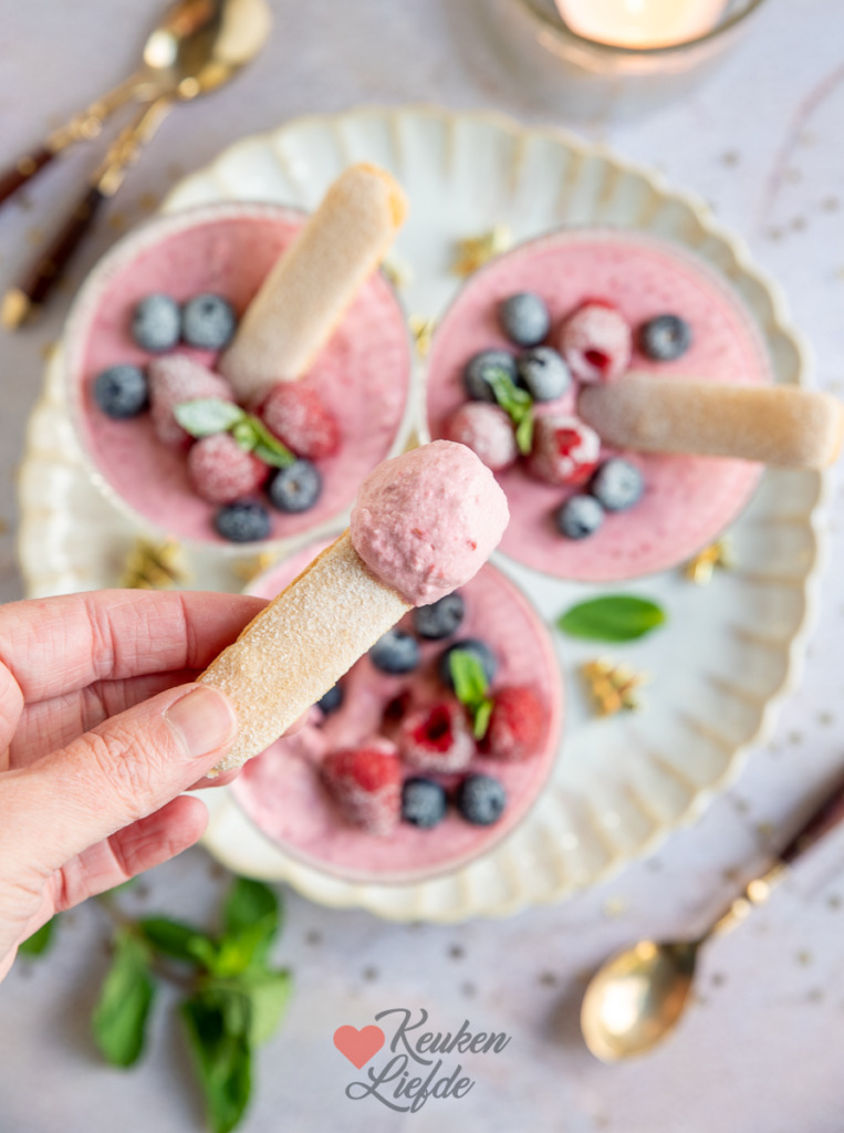 Steek in elk glas een lange vinger in de mousse. Laat minimaal 30 minuten opstijven in de koelkast.