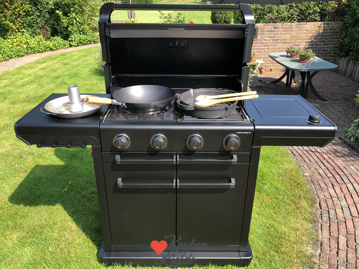 De braadpan met de groenten bereiden we op de Campingaz 4 Series Onyx S gasbarbecue. Als je het verwisselbare gietijzeren rooster — Culinary Modular-rooster — eruit haalt krijg je een uitsparing waar je een pan in kunt zetten. Dit keer dus een braadpan met groenten, maar eerder maakte ik ook deze heerlijke recepten: