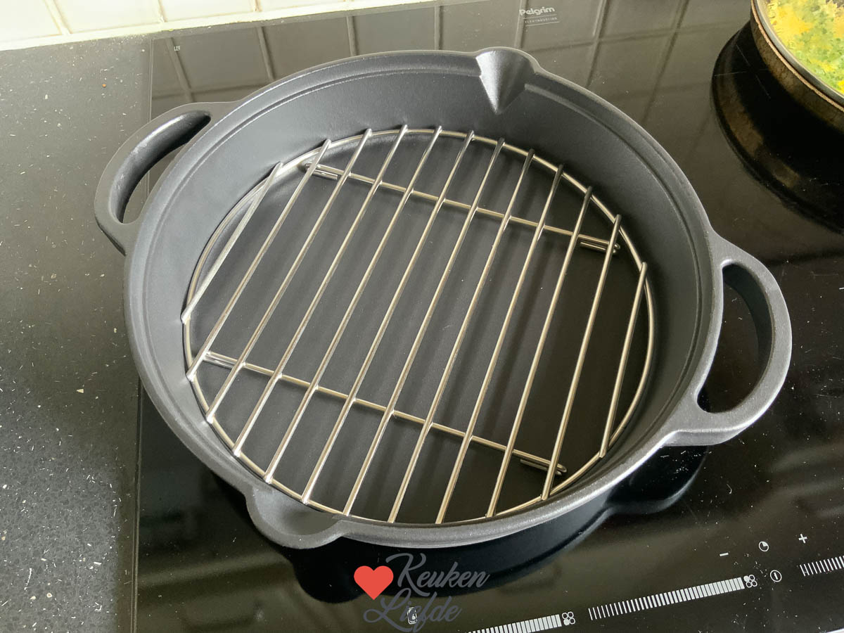 Voor dit recept gebruiken we de Campingaz Culinary Modular Braadpan, ook wel skillet genoemd, om de groenten in te roosteren. Ik doe dit op de barbecue maar het kan natuurlijk ook in de oven. De braadpan heeft een dikke gietijzeren bodem die de warmte goed verdeelt. Zo worden de groenten perfect zacht geroosterd zonder te verbranden.