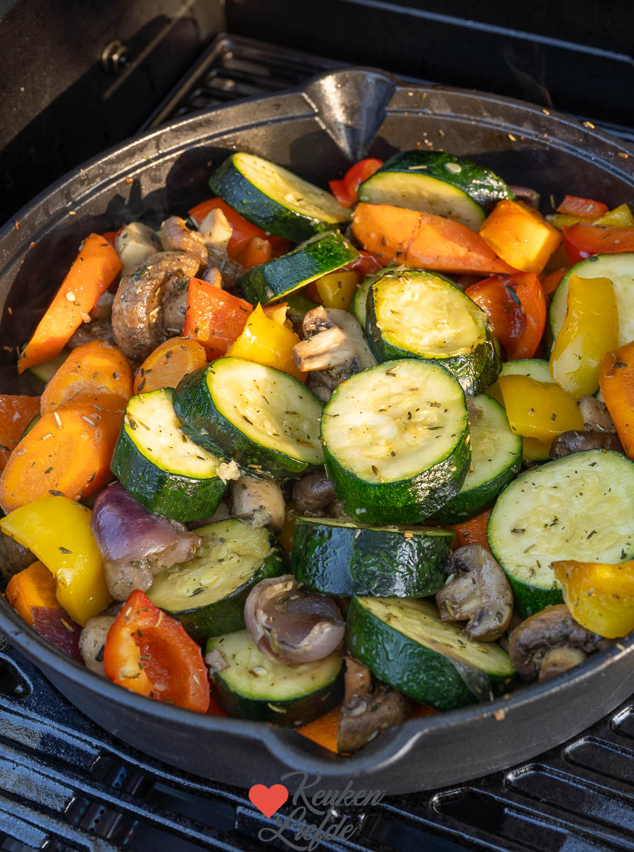 Geroosterde groenten van de barbecue. Een grote braadpan vol verse groenten met wortel, paprika, courgette en champignons. Heerlijk om buiten te bereiden op de barbecue maar het kan ook in de oven. Lekker om te serveren met een stukje vis of vlees en een aardappeltje. Zie ook onderstaande serveertips!