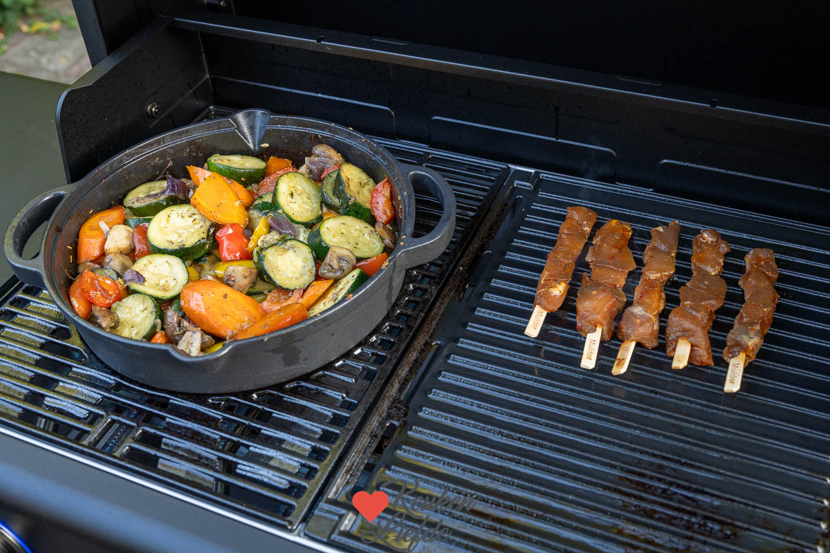 Op de bakplaat naast de skillet kun je bijvoorbeeld wat gemarineerde kipfilets (of kipsateetjes) en krieltjesspiezen bakken voor een volledige maaltijd.