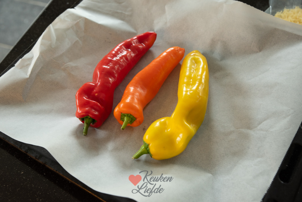 - 3 zoete puntpaprika’s (ik had geel, oranje en rood)