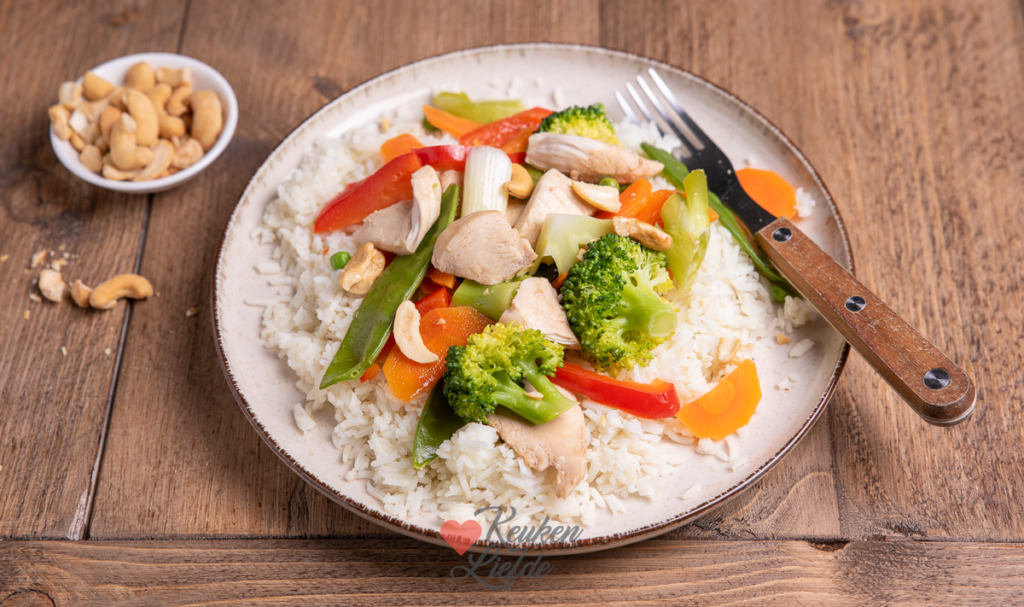 Serveer de gestoomde kip en groenten (vergeet het verrukkelijke kookvocht onderin het mandje niet) met rijst en cashewnoten en druppel wat citroensap over je gerecht.
