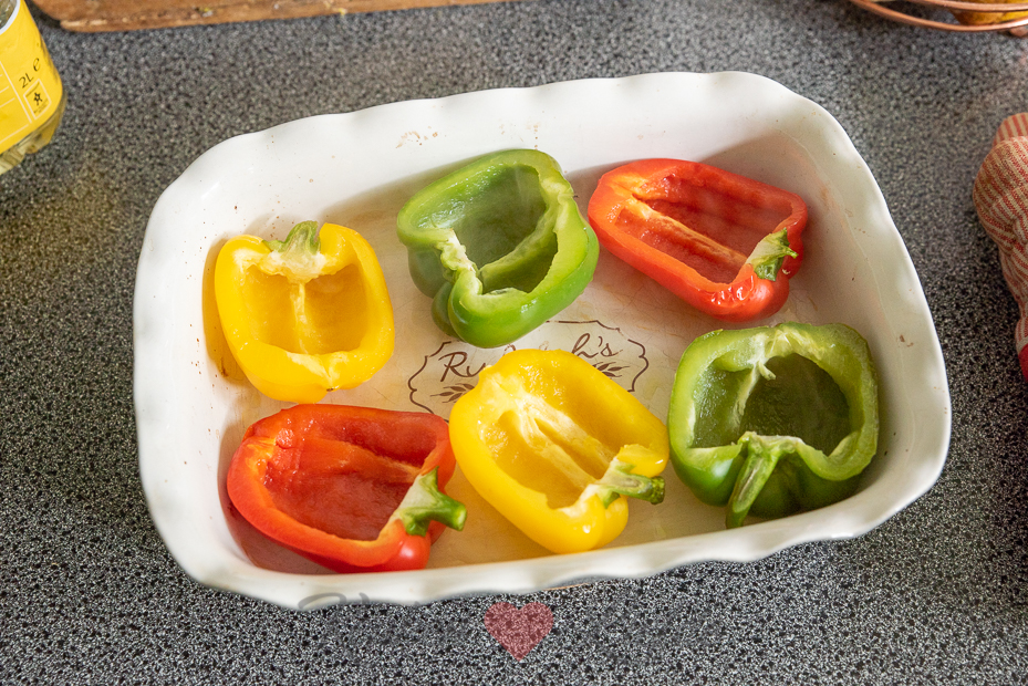 Halveer de paprika’s over de lengte en verwijder de zaadlijsten. Leg de paprika’s met de bolle kant naar boven in de ovenschaal. Bak 10 tot 15 minuten in het midden van de oven, of tot ze iets zachter zijn maar nog wel stevig genoeg om te vullen.