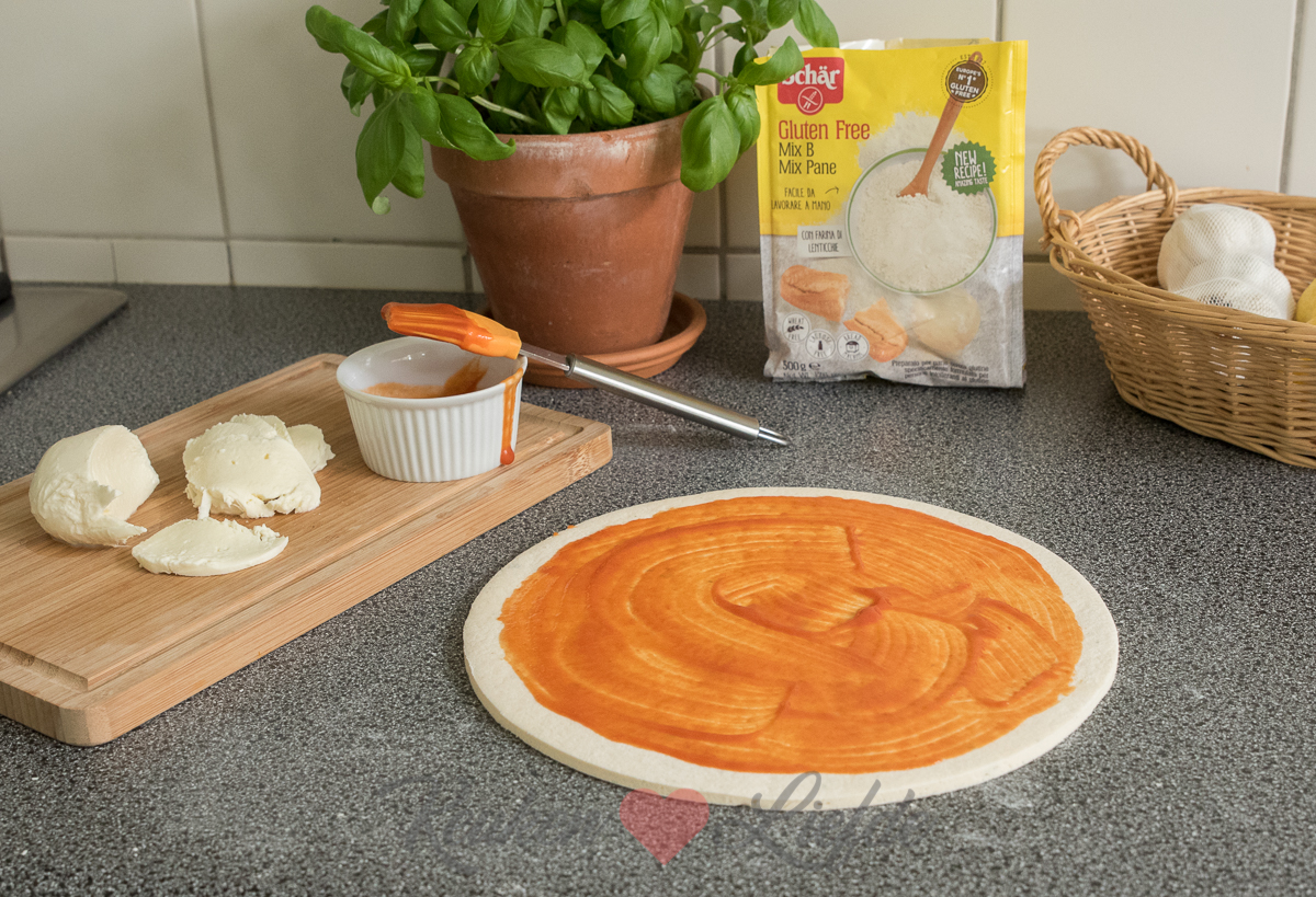 Kneed het deeg kort even door en stort op een licht bebloemd werkblad. Rol uit tot een ronde of rechthoekige pizzabodem. (Voor een perfect ronde pizza legde ik een rond bord op het pizzadeeg en sneed hem rondom af met een mes. Dit hoeft echter niet, rommelig rustiek is ook prachtig!) Leg de pizzabodem op een met bakpapier bekleed bakblik. Bestrijk de bodem met tomaten frito (houd circa 1,5 cm van de rand vrij) en beleg naar keuze. Ik belegde mijn pizza met geraspte jong belegen kaas, mozzarella en verse basilicum. De rand van de pizza kun je eventueel bestrijken met wat olijfolie, dan krijgt hij tijdens het bakken wat kleur. Na het bakken in de oven topte ik de pizza af met wat Parmaham, rucola, wat extra basilicum en wat toefjes verse pesto.