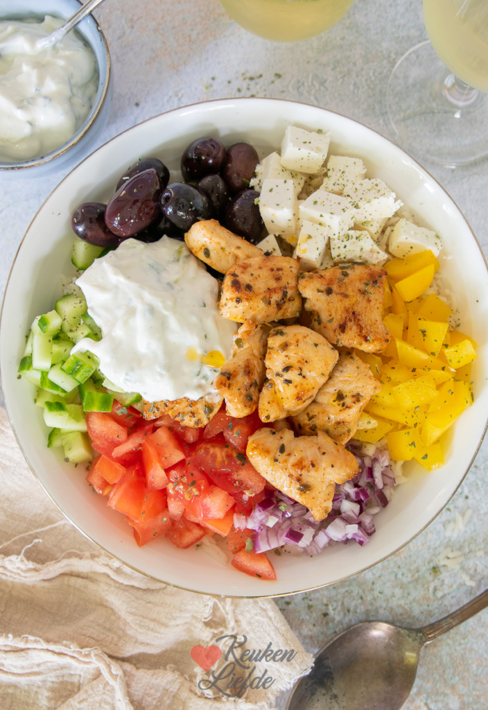 Griekse rijstbowl met kip en tzatziki. Een lekker gerecht dat snel op tafel staat. Deze Griekse rijstbowl kun je ook makkelijk maken voor een grotere groep mensen. Kook daarvoor een grote pan met rijst en bak een grote pan met kip. Zet de pan rijst, de kip en alle overige ingrediënten in kleine bakjes op tafel zodat iedereen zichzelf kan bedienen.