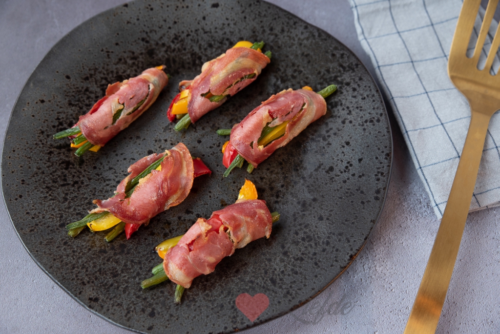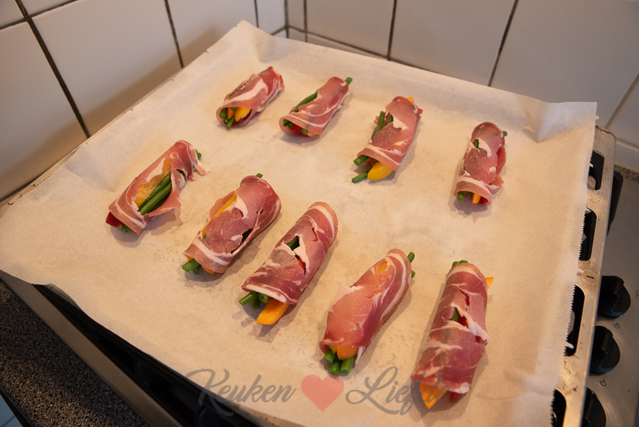Leg een plakje pancetta op een snijplank en rol daar wat haricots verts en drie kleuren paprika in. Leg de groenterolletjes op het bakblik.