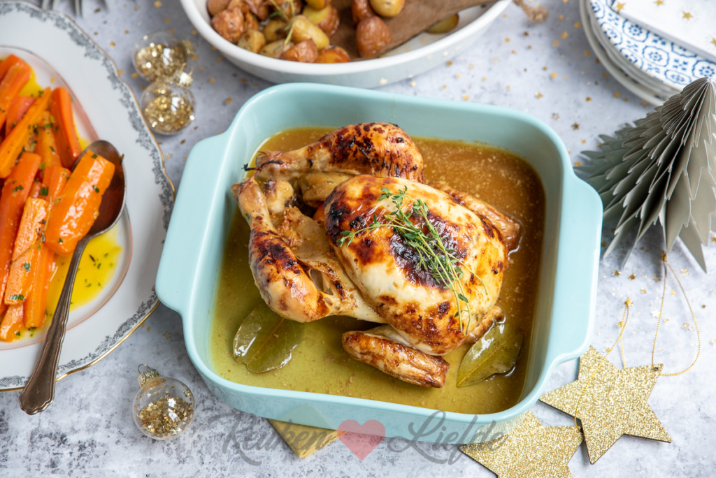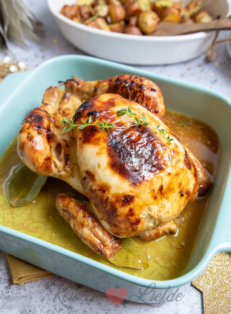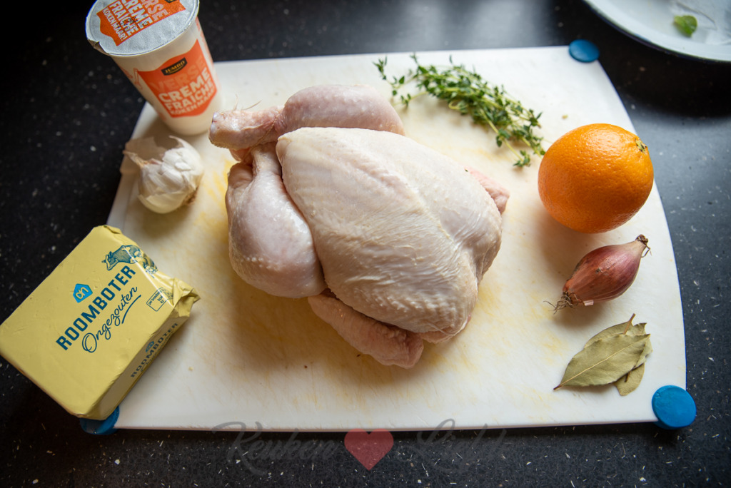 Een hele kip uit de oven moeilijk om te maken? Think again! Het is niet voor niks een van mijn favoriete gerechten om te maken als ik iets feestelijks wil serveren zonder al teveel moeite. Deze hele kip is onder de huid gevuld (dat is heel makkelijk, zie de bereiding) met crème fraîche, dragon en sinaasappelrasp wat zorgt voor een aromatische smaak. De kip is heerlijk mals en het vrijgekomen vleesvocht kun je als jus bij de kip serveren. Serveer deze hele kip uit de oven bijvoorbeeld tijdens het kerstdiner met gesmoorde worteltjes en geroosterde aardappeltjes uit de oven. Als je een grote braadslee gebruikt kun je — geschilde en gehalveerde — aardappel of krieltjes (die hoef je niet te schillen) in de braadslee bij de kip doen. Ze hebben ongeveer dezelfde bereidingstijd en door het garen in het vleesvocht krijgen de aardappeltjes een heerlijke smaak.