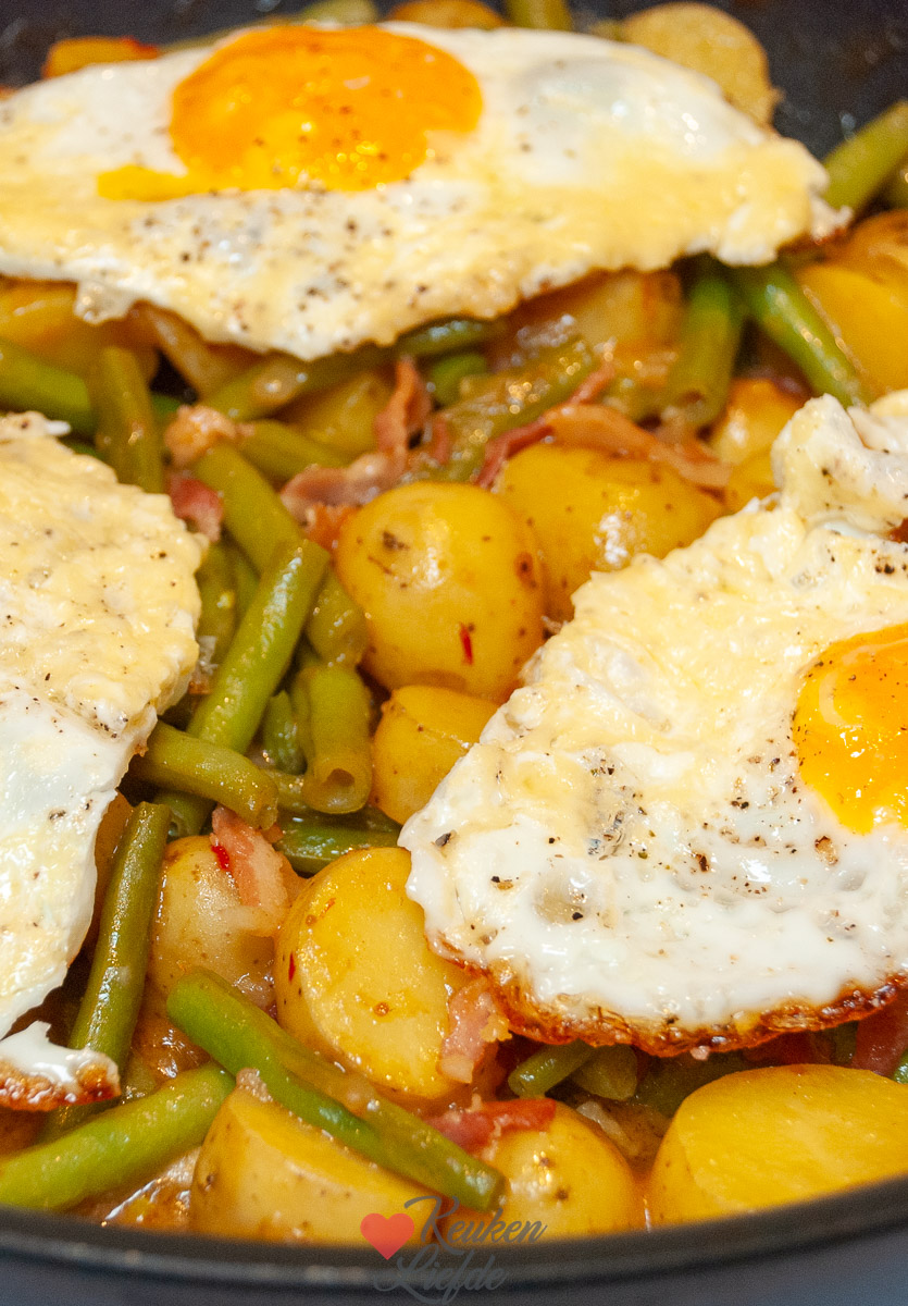 Ik ben dol op makkelijke eenpansgerechten zoals dit Hollands satépannetje met sperziebonen en krieltjes in satésaus. Ik serveer het met gebakken eieren bovenop voor een complete (vega) maaltijd. Zie ook de tip hieronder voor een variant met kip.