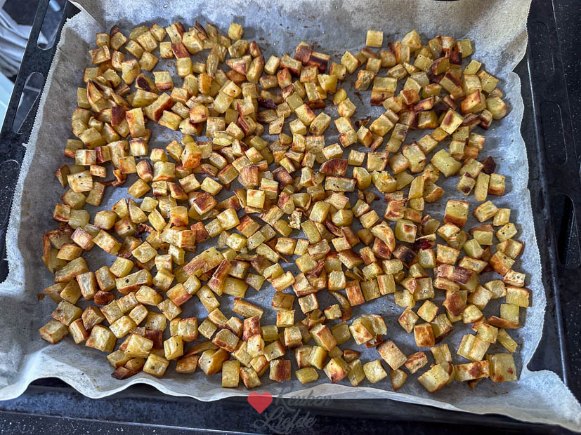 - 400 – 500 g zoete aardappel, geschild en in blokjes