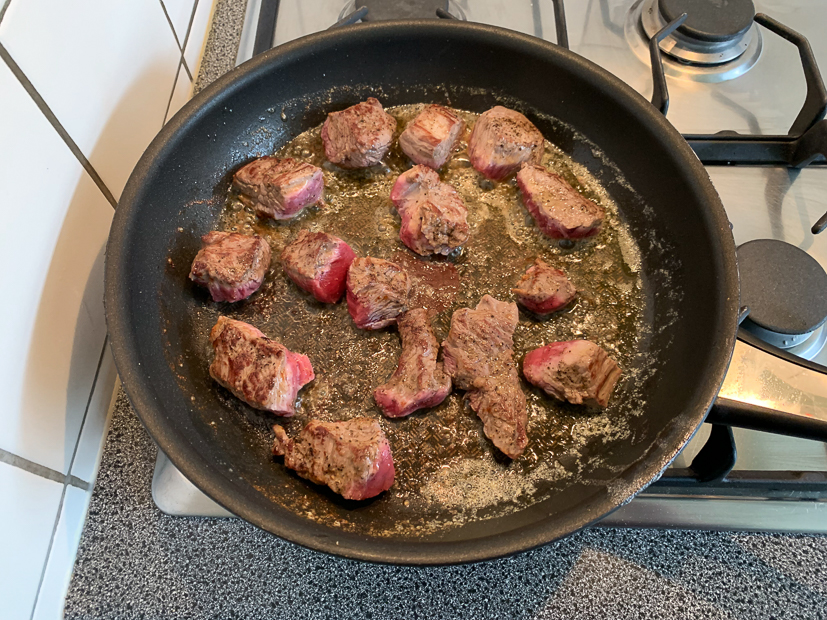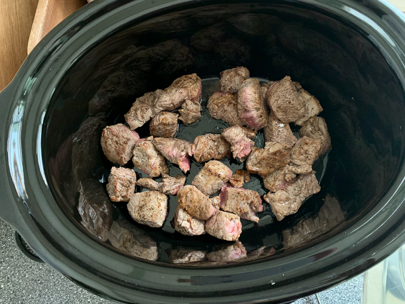 Verhit een ruime koekenpan met anti-aanbaklaag met een flinke scheut olijfolie. Voeg de roomboter toe en laat smelten maar niet bruin kleuren. Dep het vlees droog met keukenpapier en bestrooi met zout en peper uit de molen. Bak het vlees kort aan beide kanten bruin in de koekenpan — doe dit in meerdere porties zodat de temperatuur in de pan niet teveel daalt. Schep het vlees uit de koekenpan in een braadpan met dikke bodem of in de slowcooker (voorverwarmd op stand high).