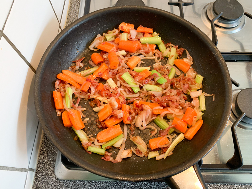 Bak de pancetta in het braadvet in de koekenpan op laag tot middelhoog vuur tot het begint te kleuren. Voeg de sjalot en knoflook toe en bak kort mee tot ze zacht zijn. Voeg de wortel en bleekselderij toe en bak nog een minuut verder. Schep de groenten over het vlees in de braadpan of slowcooker.