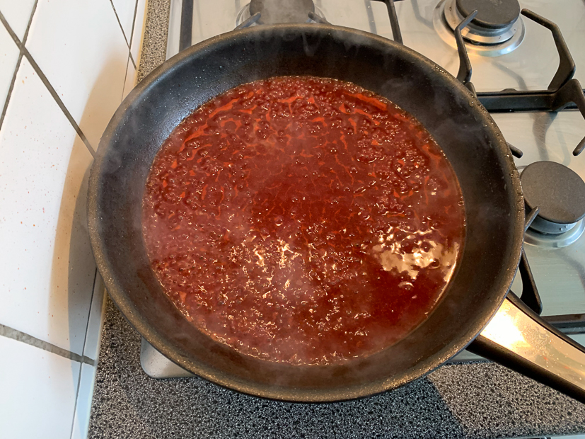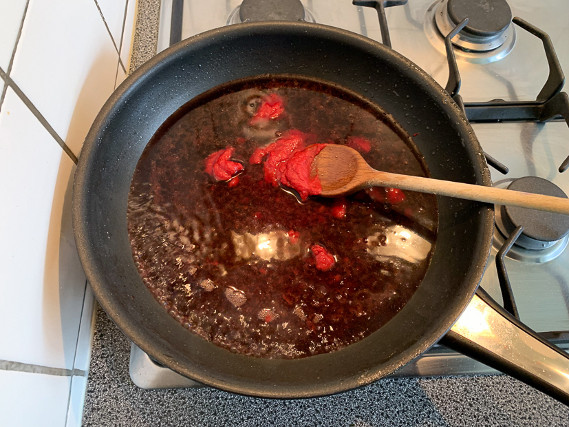 Bak de tomatenpuree 1 minuut in het braadvet in de koekenpan om te ontzuren. Voeg de rode wijn toe en laat al roerend op hoog vuur enkele minuten inkoken tot de saus glad en wat dikker is. Voeg de inhoud van het blik gepelde tomaten toe, de balsamicoazijn en leg het takje rozemarijn in de saus. Laat de saus 1 minuut zachtjes pruttelen. Verwijder het takje rozemarijn en schenk de saus over het stoofvlees en de groenten.
