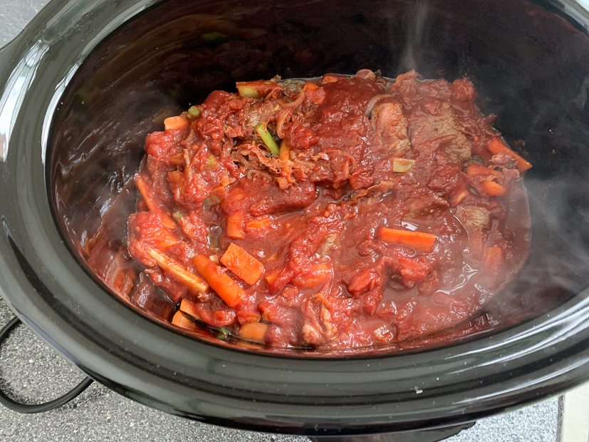 Bij bereiding in de slowcooker heb je weinig stoofvocht nodig omdat er tijdens het stoven bijna geen vocht verdampt. Bij bereiding in een braadpan zal er tijdens het stoven wel vocht verdampen en kun je wat meer vocht toevoegen — zoveel dat het vlees net niet helemaal onderstaat. Als je te weinig vocht hebt in de braadpan kun je dit aanvullen met water of rode wijn.