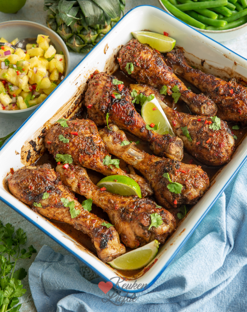 Serveer de jerk chicken met het marinadevocht en de ananassalsa.