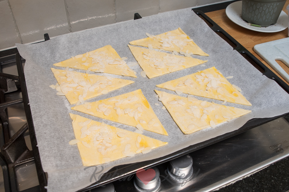 Laat de plakjes bladerdeeg half ontdooien zodat ze licht buigbaar maar nog wel stevig zijn. Snijd ze diagonaal doormidden zodat je twee driehoeken krijgt. Verdeel de driehoeken over 2 bakblikken bekleed met bakpapier. Bestrijk de driehoeken met koud water en bestrooi met het amandelschaafsel en 2 eetlepels kristalsuiker. Bak 10 tot 12 minuten in het midden van de oven totdat ze goudbruin zijn. Haal ze uit de oven en laat volledig afkoelen. Wil je het bladerdeeg van tevoren maken? Bewaar het bladerdeeg – als het volledig is afgekoeld – in een luchtdichte bak of zak.