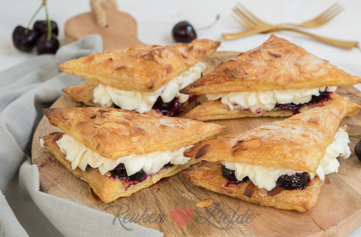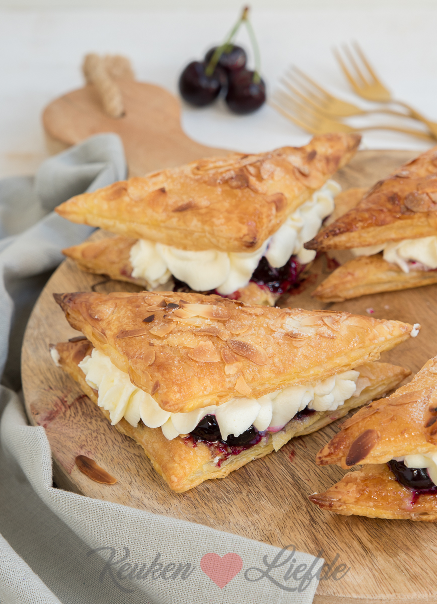 Druk van 5 bladerdeegdriehoekjes de bovenkant van het bladerdeeg iets in zodat de kersenvulling er beter op blijft liggen. Verdeel de kersencompote erover en bedek met een mooie toef slagroom. Dek af met het overige bladerdeeg. Serveer direct.