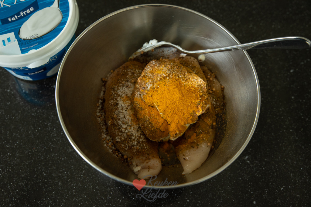 Doe de kip in een kom samen met de yoghurt, garam masala, paprikapoeder, kurkuma, olie en zout en peper uit de molen. Wrijf de yoghurt en specerijen goed in de kip.
