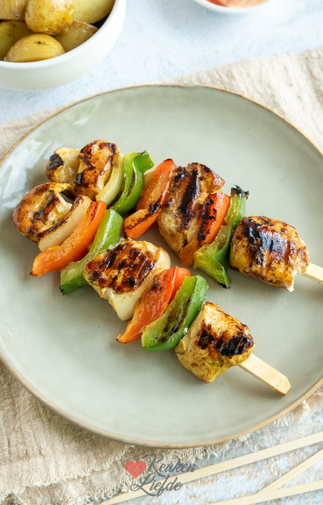 Heerlijke kip tikka masala spiezen voor op de barbecue. Door de kip te marineren in yoghurt en masala specerijen krijgt hij een lekkere smaak en blijft hij lekker mals op de barbecue. Lekker om te serveren met raita (frisse yoghurtsaus met geraspte komkommer, limoen en munt en knoflook), naanbrood en rauwkost, een couscoussalade, of met geroosterde aardappels.