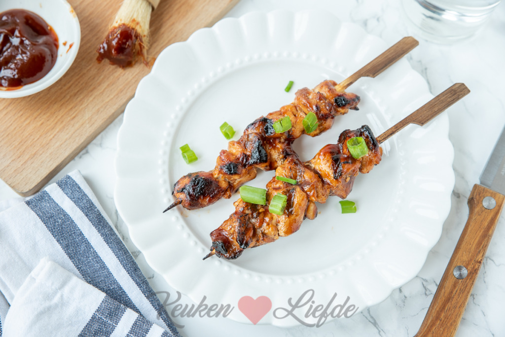 Deze kipspiezen zijn gemarineerd in barbecuesaus voor een heerlijke smaak. Tijdens het grillen worden ze nog een keer ingekwast met barbecuesaus. Zo krijgen ze een verrukkelijk sticky laagje!