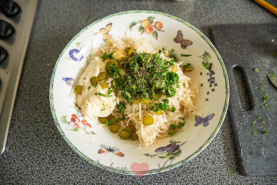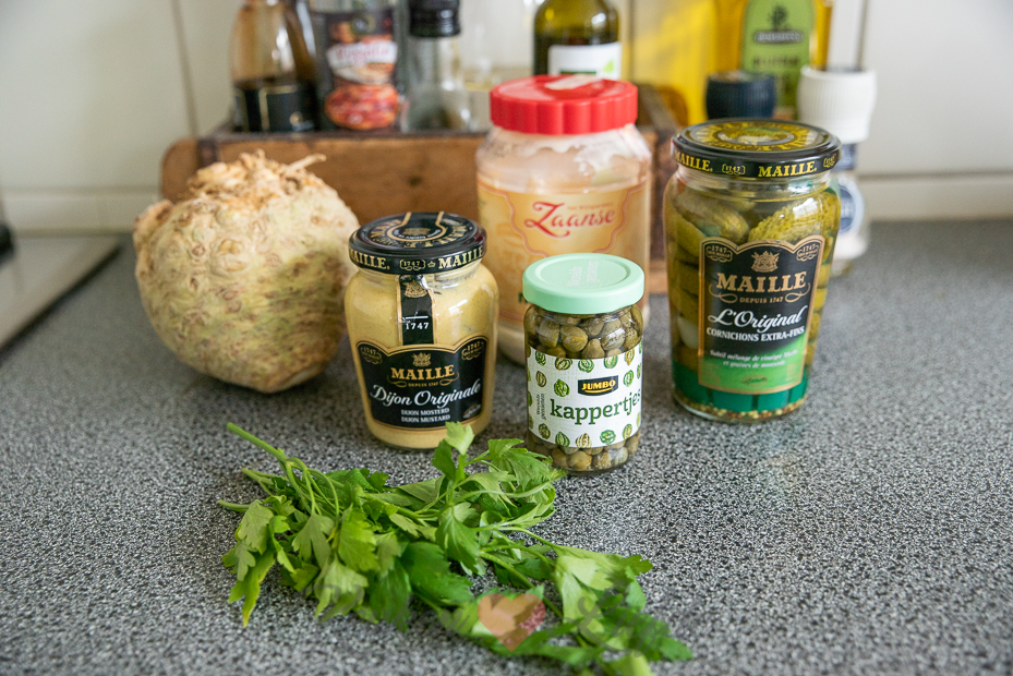 - 3 à 4 stuks cornichons (kleine cocktail augurkjes), fijngehakt