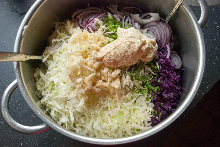 Ik maak deze koolsalade met witte en rode kool. Witte kool is mild, lichtzoet en neutraal van smaak, rode kool is iets pittiger en heeft een aardse smaak. Ik vind het heerlijk om ze te combineren. Je kunt dit recept eventueel ook met alleen witte kool maken.